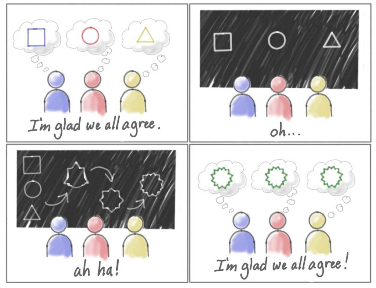 In this image, “oh..” and “ah ha!” are the conversation & talking through acceptance criteria.